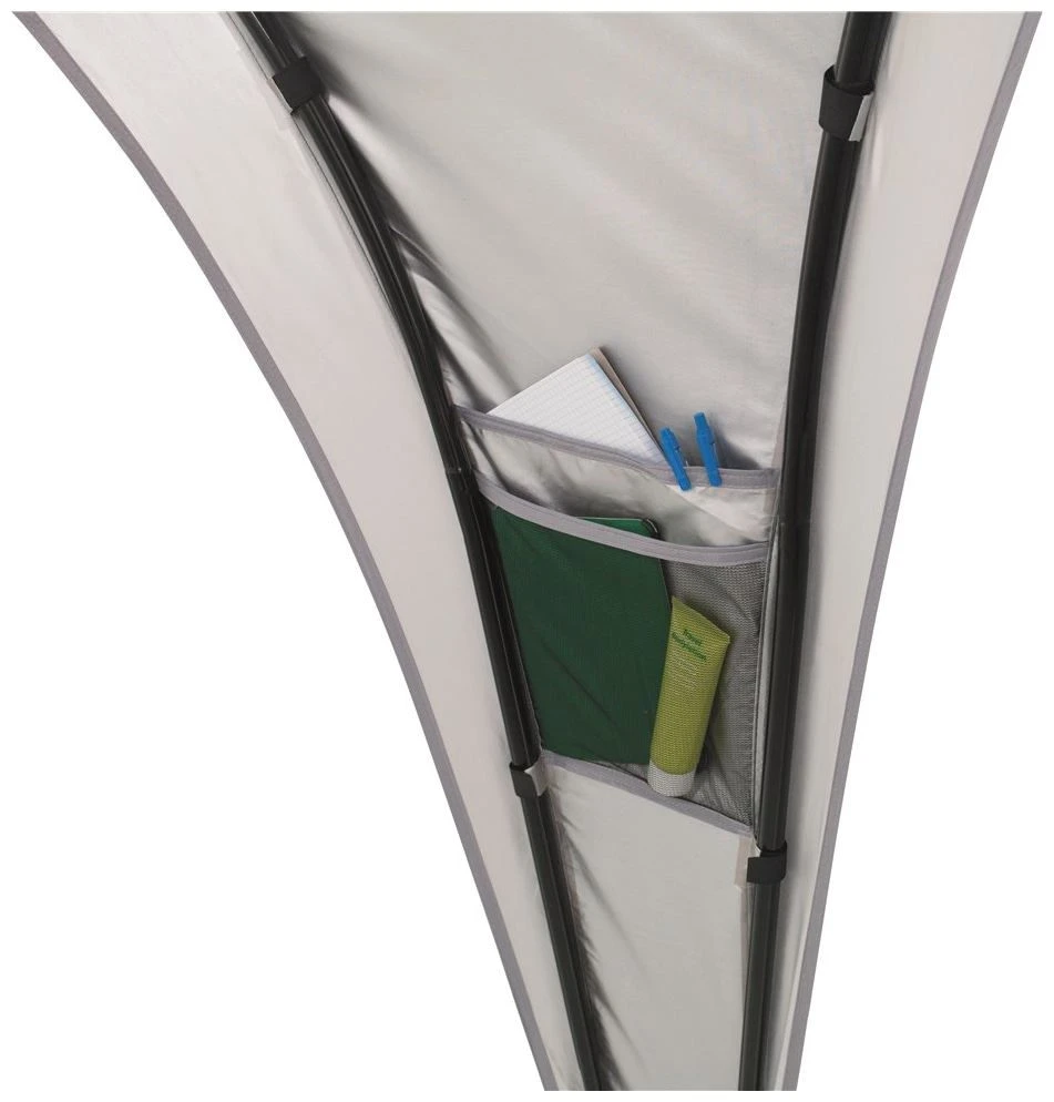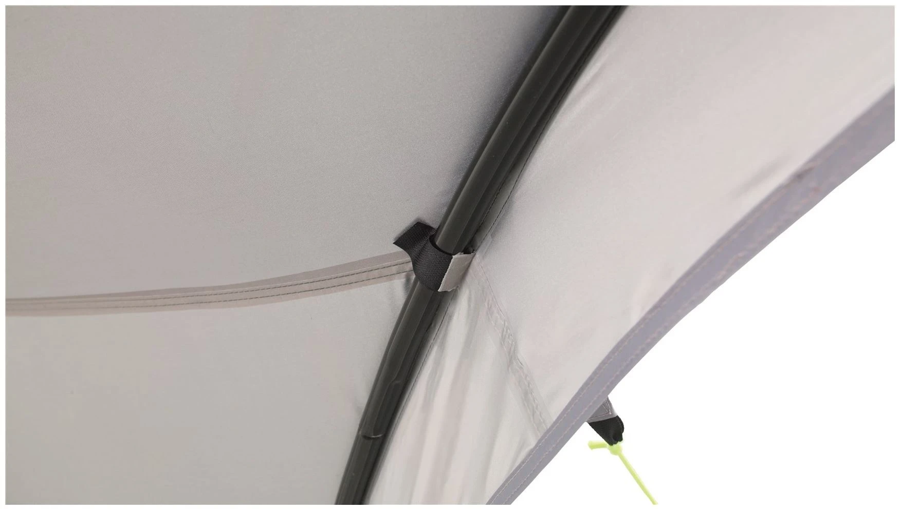 Die Outwell Summer Lounge M bietet einen vielseitig nutzbaren, frei stehenden Unterschlupf. Die äußerst robuste und stabile Konstruktion zeichnet sich durch große Zugänge und eine bequeme Stehhöhe aus. Dank der Belüftungsöffnung an der Spitze, dem Aufhängepunkt für eine Laterne in der Mitte sowie zwei Netztaschen bietet die Lounge ein Höchstmaß an praktischer Flexibilität. Der widerstandsfähige Stoff Outtex® 1500 Pro Silver bietet einen UV-Schutzfaktor von über 50. Um einen größeren geschützten Aufenthaltsbereich zu schaffen, können miteinander kompatible Schutzdächer über eine Regenrinne verbunden werden.
