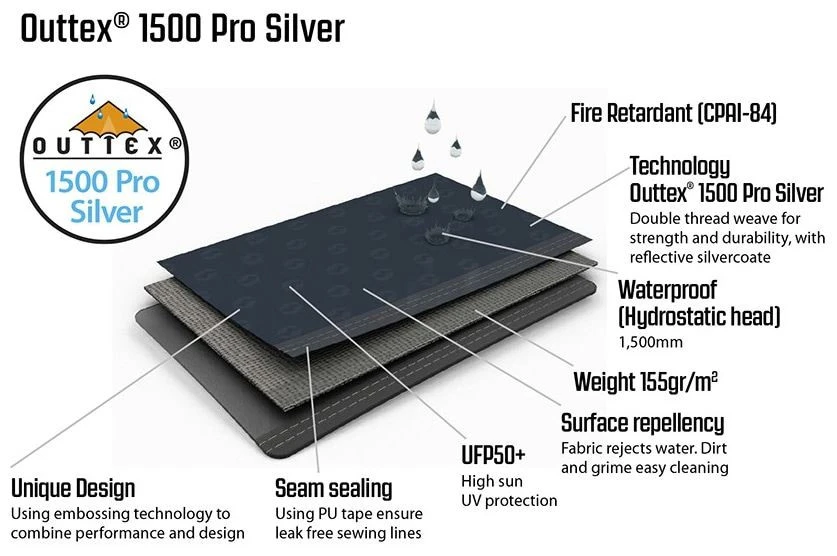 | Außenzelt | Outtex® 1500 pro Silber, 100% Polyester; |